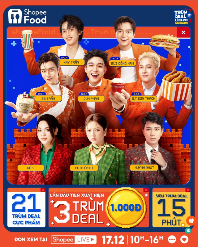Tất cả danh hiệu Trùm Deal sẽ chính thức lộ diện trong chương trình “Trùm Deal Lên Live 17.12”. Chỉ với một bình luận đơn giản, bạn không chỉ giúp idol tiến gần hơn đến ngôi vị danh giá, mà còn có cơ hội tham gia fansign từ các thành viên B.O.F trực tiếp trên sóng livestream, cũng như nhận được nhiều phần quà hấp dẫn khác. Còn chần chờ gì nữa mà không truy cập vào fanpage của ShopeeFood VN để bình chọn và giữ chỗ cho idol trên “bảng vàng” Trùm Deal nào!
