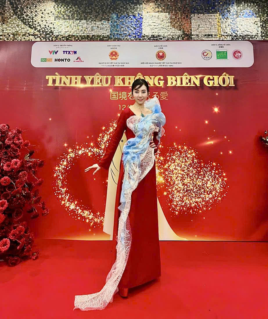 Bộ trang phục được hình thành từ cảm hứng về dòng chảy giao thoa của hai nền văn hóa Việt Nam và Nhật Bản – nơi tình yêu, nghệ thuật và sự sẻ chia không bị ngăn cách bởi biên giới. Sắc đỏ trầm gợi hình ảnh trái tim Việt Nam nồng ấm, luôn mở ra với thế giới, trong khi dải xanh lam và trắng như làn sóng Nhật Bản vươn mình ra biển lớn, tượng trưng cho sự tinh tế, tĩnh tại và tôn trọng tự nhiên của xứ sở mặt trời mọc. Khi hai sắc màu hòa quyện, chúng tạo nên một bản giao hưởng của cảm xúc – nơi truyền thống và hiện đại, phương Đông và phương Đông gặp nhau trong cùng một nhịp đập nhân văn. Các chi tiết trên trang phục được tạo tác từ vật liệu tái chế và sợi vải tái sinh, là ẩn dụ cho sự hồi sinh và tái tạo của thiên nhiên – cũng là thông điệp về “tình yêu bền vững”, một tình yêu không chỉ giữa con người với con người, mà còn giữa con người và hành tinh mà ta đang sống.