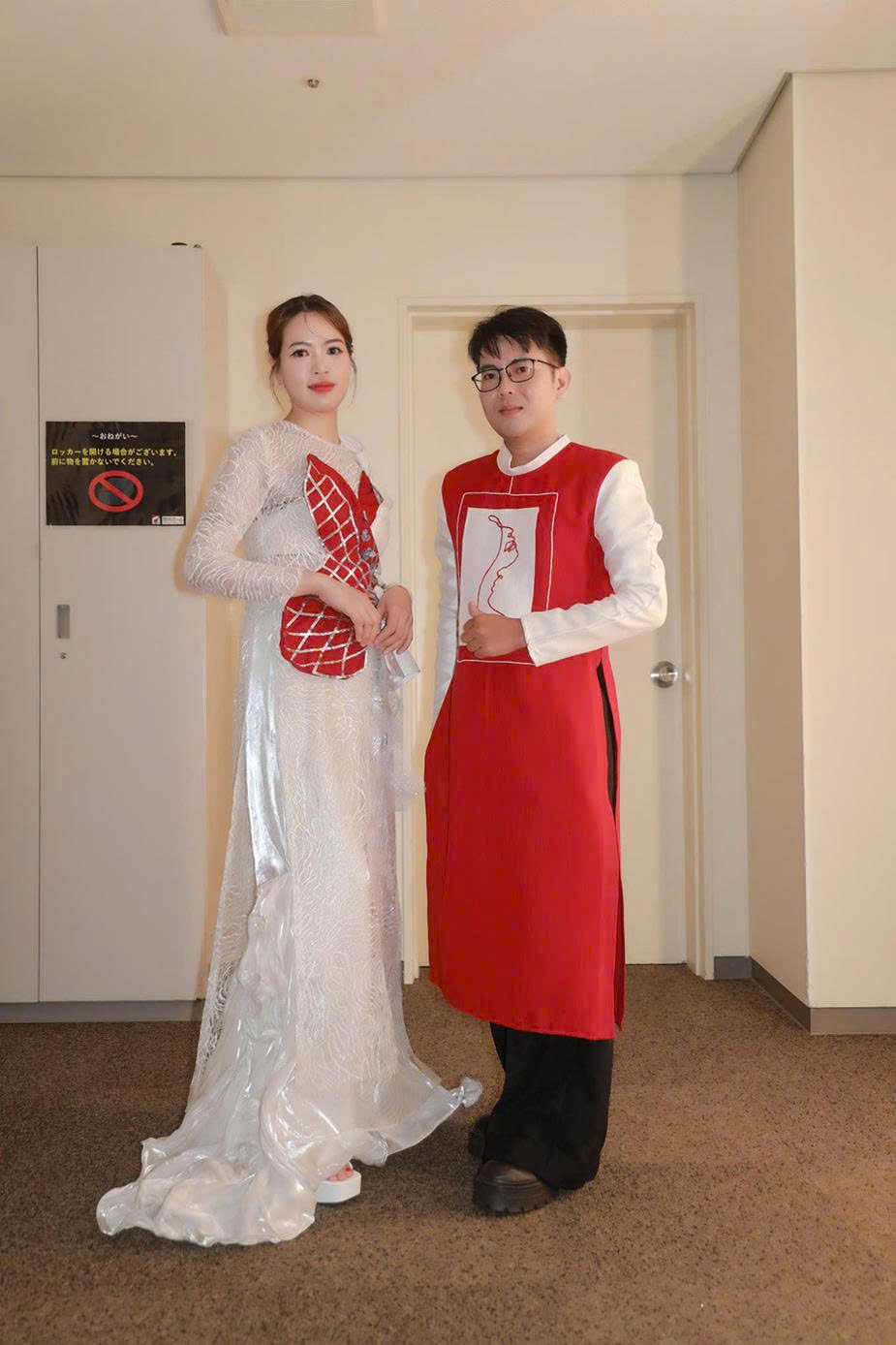 Phan Thị Tâm- Hiện đang làm việc trong nghành thực phẩm ở Kanagawa Nhật Bản trong trang phục của Lê Minh Phú chụp hình kỉ niệm sau sân khấu.