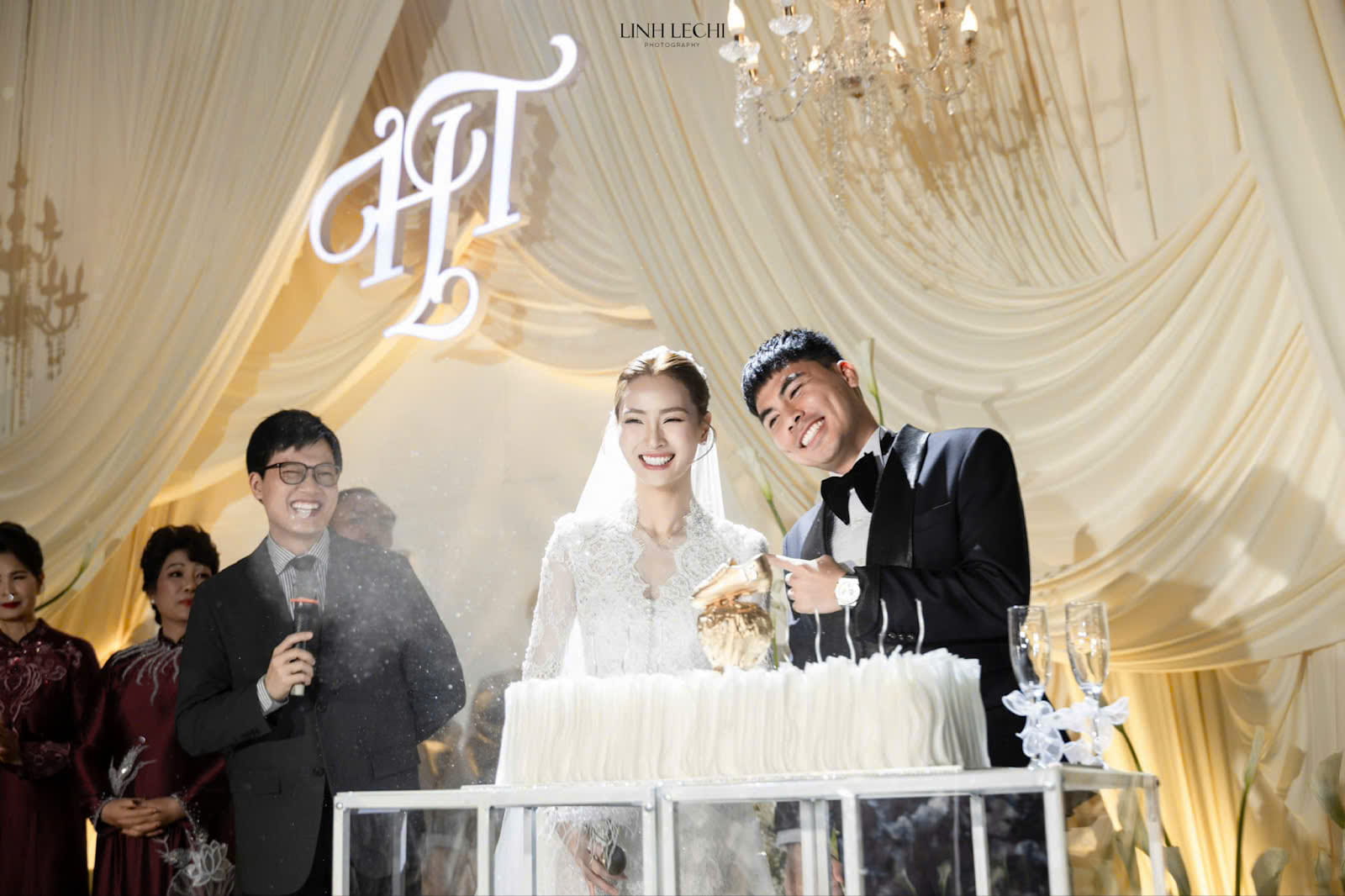Ngay sau giây phút thiêng liêng ấy, toàn bộ ánh đèn trung tâm của hội trường dịu lại, nhường chỗ cho ánh sáng lung linh, ấm áp. Không có sự xuất hiện của những tòa tháp bánh kem cao ngất ngưởng cầu kỳ thường thấy, Trang Mù Tạt và Đức Huy tay trong tay tiến về phía chiếc bàn tiệc nhỏ nhắn. Tại đó, một chiếc table cake tone trắng thể hiện tình yêu thuần khiết và trong sáng của cặp đôi. Đặc biệt, điểm nhấn của chiếc bánh là chi tiết chiếc cúp giày vàng - biểu tượng vua phá lưới - được tạo hình tinh xảo bên trên. Trên giày có khắc số 15, số áo quen thuộc của tiền vệ Đức Huy.