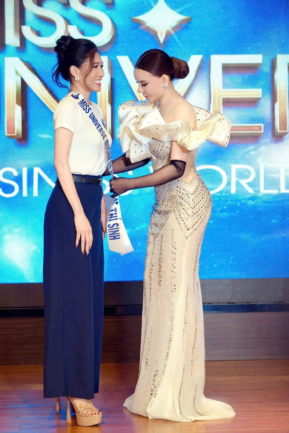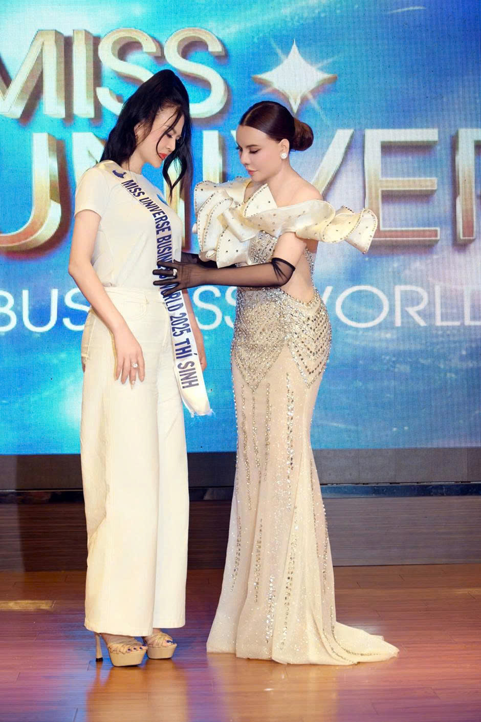 Xuất hiện với phong thái thanh lịch, NTK Mai Phương Trang – Nhà tài trợ Kim cương của cuộc thi đã đích thân trao sash cho thí sinh trong không khí trang trọng. Khoảnh khắc ấy không chỉ thể hiện sự chuyên nghiệp của ban tổ chức mà còn là nguồn động viên tinh thần lớn lao dành cho dàn thí sinh đến từ nhiều quốc gia khác nhau, những người đang mang trong mình khát vọng chinh phục vương miện danh giá của Miss Universe Business World 2025.